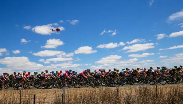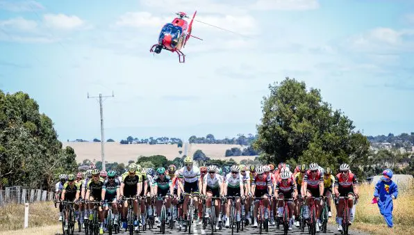 The helicopter hovers over the WorldTour Elite Men's race peloton