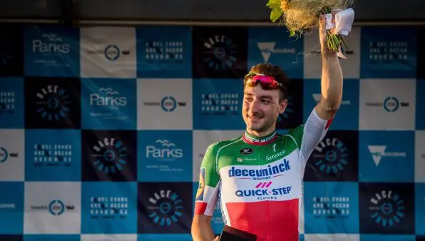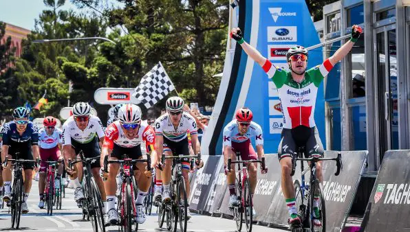Elia Viviani won the 2019 Elite Men's race in a close finish with Caleb Ewan