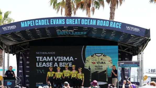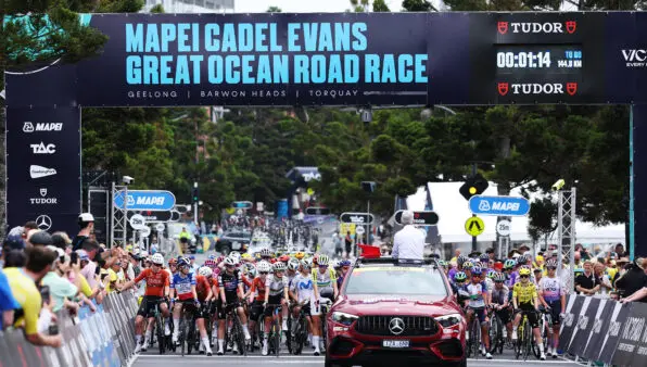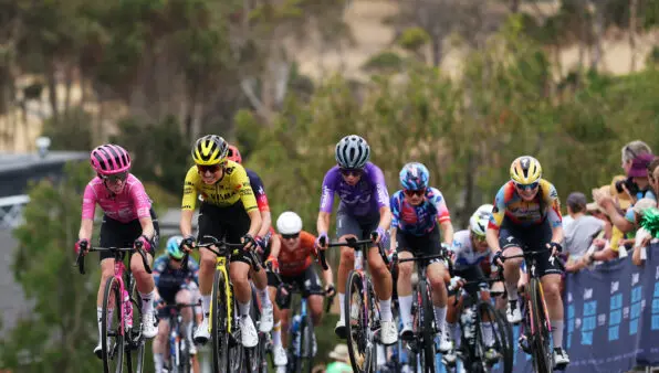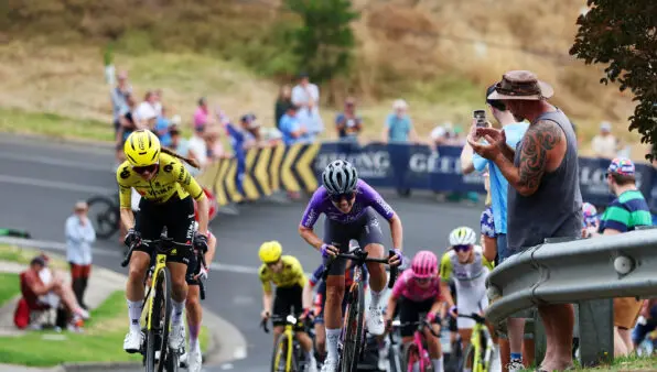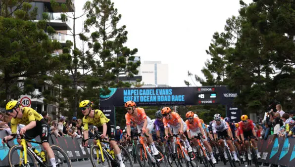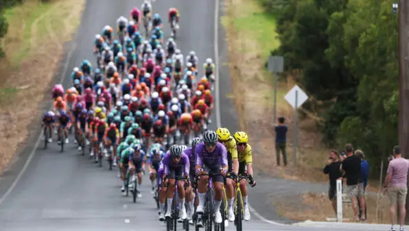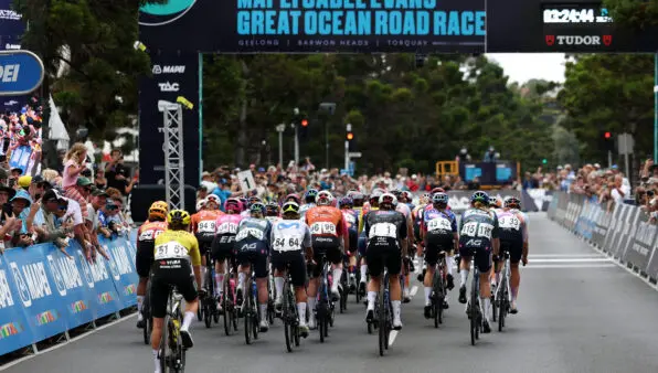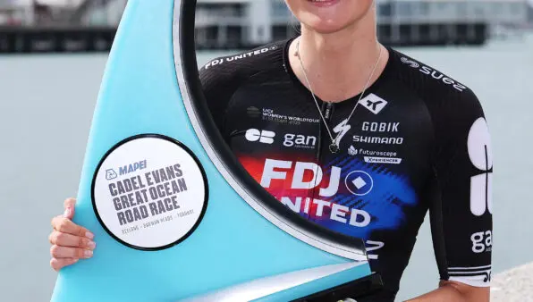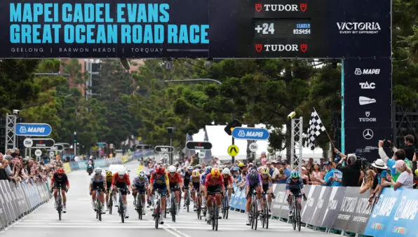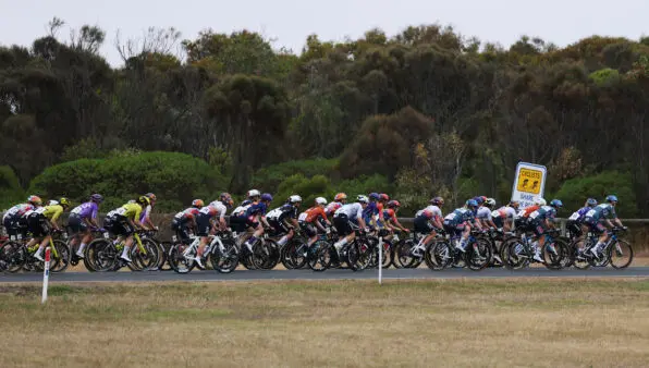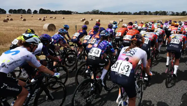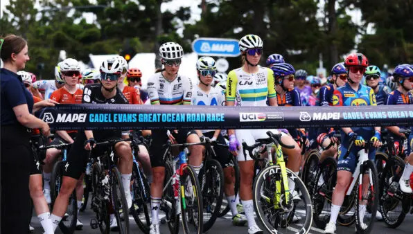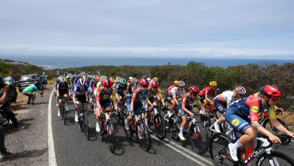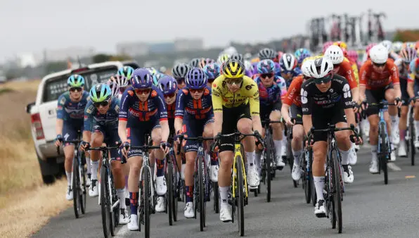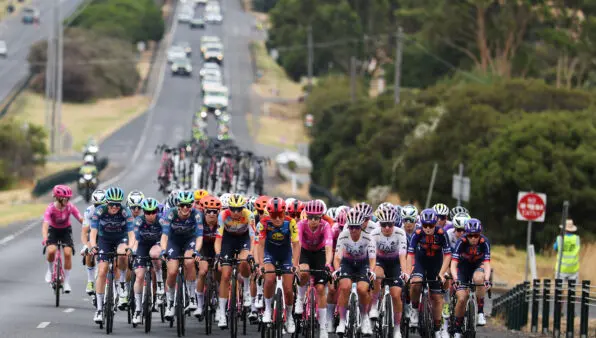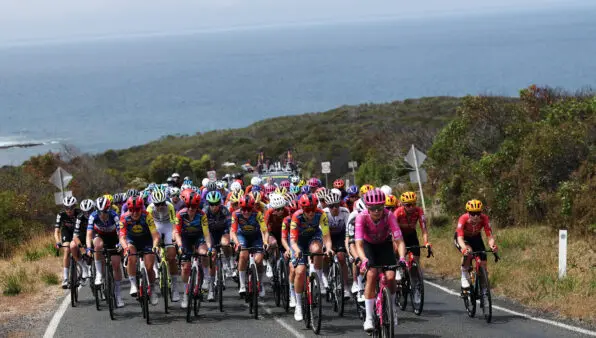 GEELONG, AUSTRALIA - JANUARY 31: (L-R) Ally Wollaston of New Zealand, Marie Le Net of France and Team FDJ United - SUEZ, Lauretta Hanson of Australia and Team Lidl - Trek, Mackenzie Coupland of Australia and Team Liv AlUla Jayco, Amanda Spratt of Australia and Team Lidl - Trek, Nicole Steigenga of Netherlands and AG Insurance - Soudal Team, Loes Adegeest of Netherlands, Emma Cecilie Norsgaard Bjerg of Denmark and Team Lidl - Trek, Alena Ivanchenko of Russia and UAE Team ADQ, Stina Kagevi of Sweden and Team EF Education - Oatly and Anouska Koster of Netherlands and Team Uno-X Mobility compete during the 10th Mapei Cadel Evans Great Ocean Road Race 2026, Women's Elite a 141.2km one day race from Geelong to Geelong / #UCIWWT / on January 31, 2026 in Geelong, Australia. (Photo by Con Chronis/Getty Images)