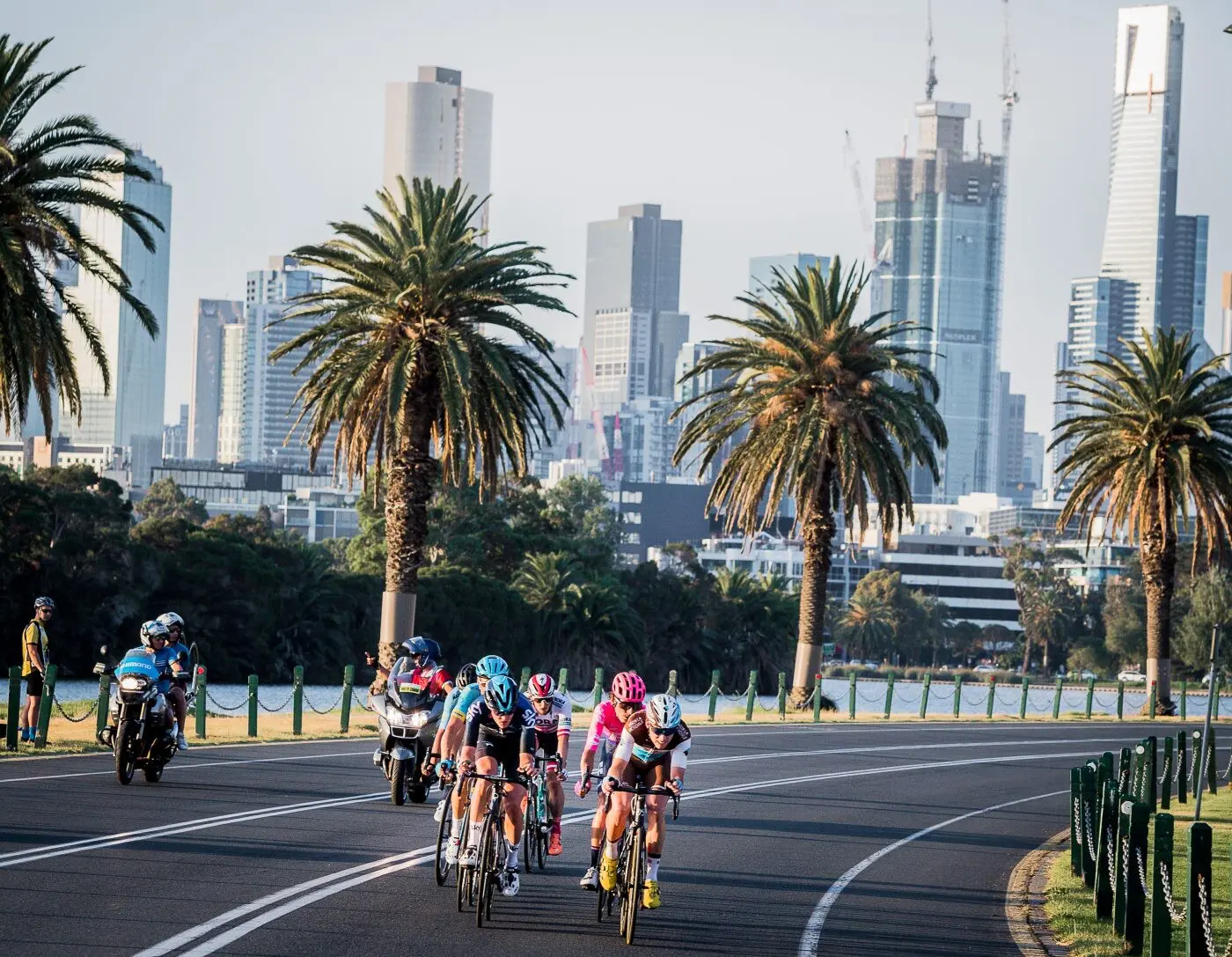 The peloton blasts past with Melbourne’s stunning skyline as the backdrop [Image: James Startt]