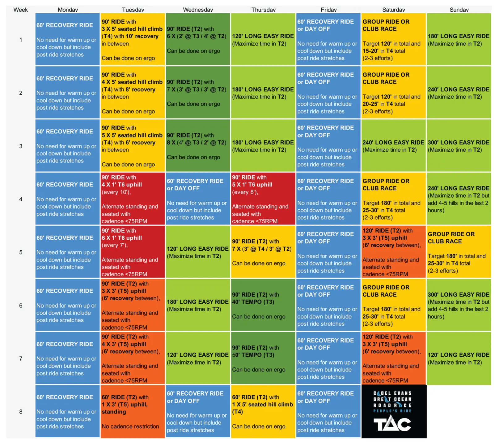 Weekday rides can be done on the road (ideal) or the ergo. Weekend rides can be swapped around to fit with any club/ group schedule. Climbing should be done alternating standing and seated position (one repetition standing and the next one seated).