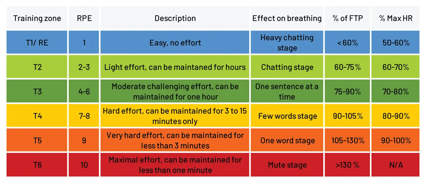 List of acronyms: Recovery (RE), Rate of Perceived Exertion (RPE), Function Threshold Power (FTP), Heart Rate (HR)