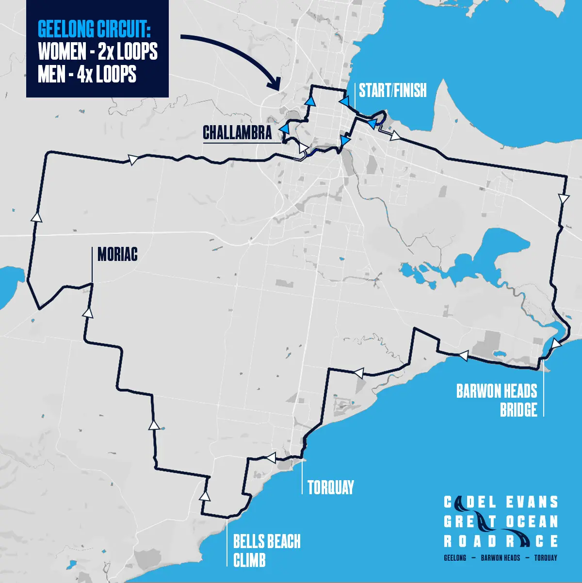 Clockwise from the traditional start/finish line on the Geelong waterfront, the elite peloton will race down to Ocean Grove and across the famous bridge to Barwon Heads, along the coast to Torquay, onto the majestic Bells Beach and back toward Geelong via the scenic Australian countryside of Moriac and Ceres.