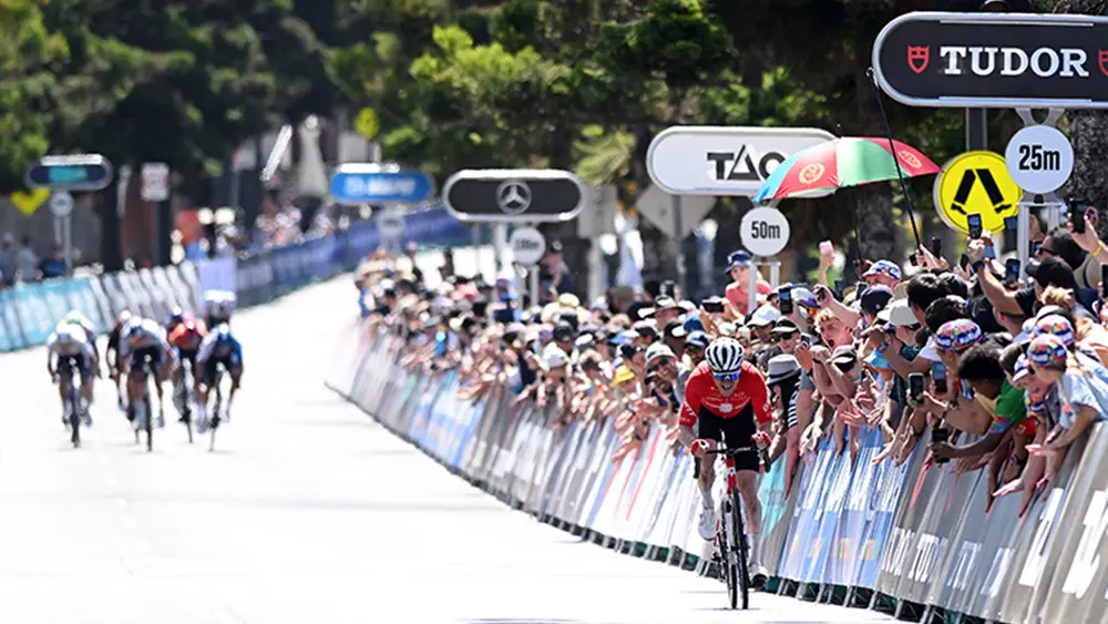 Swiss road race champion Mauro Schmid (Team Jayco AlUla) claimed victory over Aaron Gate (XDS Astana Team) and Laurence Pithie (Red Bull-BORA-hansgrohe) in brutal conditions to win the Cadel Evans Great Ocean Road Race – Men.